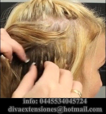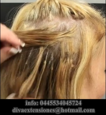 Exprime suavemente tu cabello y enróllalo con una toalla para eliminar el exceso de agua.![]() A continuación, cepilla el cabello con un cepillo de dientes anchos, sólo de medios a puntas, comenzando siempre de abajo hacia arriba. Nunca comenzar a cepillar una extensión del pelo cerca del cuero cabelludo. En caso de las extensiones de mecha por mecha es necesario separar una a una cada mecha según se ilustra e la imagen ![]() ![]() Posteriormente, con el cepillo especial para extensiones podrá cepillar los puntos de fijación y el cuero cabelludo sin ningún problema. Ya que este cepillo ha sido diseñado para no entrar en los puntos de fijación y poder cepillar su cuero cabelludo. En caso de no tener este cepillo será necesario desenredar los puntos de unión con los dedos.