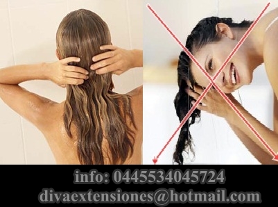 un shampoo de la línea elvive de L’Oreal u otro de buena calidad como herbal essences, frutics, palmolive etc. De preferencia que sea un shampoo de hidratación profunda . Coloca la cantidad de shampoo necesaria en la palma de tus manos y frótalas aplícalo en tu cuero cabelludo y deslízalo suavemente por todo tu cabello hasta las puntas, o bien para evitar utilizar shampoo en exceso puedes colocar una pequeña cantidad del shampo en un recipiente (bandeja) y mezclar con el triple de agua, y aplicarlo en todo tu cabello empezando en la nuca alta y dejando que resbale hasta las punta, jamás refriegues o talles fuertemente el cabello porque esto provocara que se enrede demasiado. Una vez que enjuagues el shampoo deberás colocar acondicionador (de las marcas recomendadas, ya que un buen acondicionador es de suma importancia) solo de medios a puntas sin que el acondicionador toque el cuero cabelludo, de lo contrario la unión se aflojara rápidamente. Una vez enjuagado el acondicionador es recomendable utilizar de la misma forma que el acondicionador una crema de enjuague (las cremas de elvive loreal son muy buenas) esta cremas por lo general tienen un tiempo de pose de aproximadamente 3 a 5 minutos y después se enjuagan.
